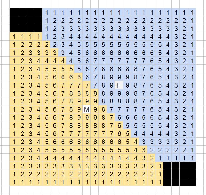 In the below example, an altar of Fo and an altar of Magranon are within 4 tiles of each other. The resulting domain influence for each tile is pictured.