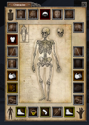 The border area of the window focuses on the items which can be equipped. Items may be added to these boxes by dragging them from an inventory window and releasing over one of the boxes or via the right-click menu on objects in the inventory and selecting equip. Some items have multiple equip options such as weapons, so that an off-hand weapon may be specifically equipped. Hover over each to get a description, there is an overview of which items may be equipped to each slot on the inventory page.