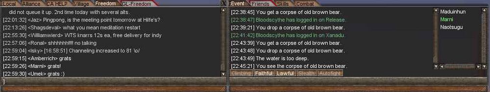 Local is a channel for players within about 320 meters (80 tiles) radius from your position. The local channel is close to free speech, but you may not use offensive language, such as racist, sexist, and homophobic comments, or talk about illegal drugs or substances. Both Blacklighters and Whitelighters can talk here. It is possible for players to be within the 80 tile radius and not appear in the list of names if they are stealthed or inside a mine, upon walking into the mine of where a player is located the local distance is then lowered to 20 tiles. Note that if you do not want to receive messages from a certain player, use (/ignore <name>) to stop their comments from being seen.