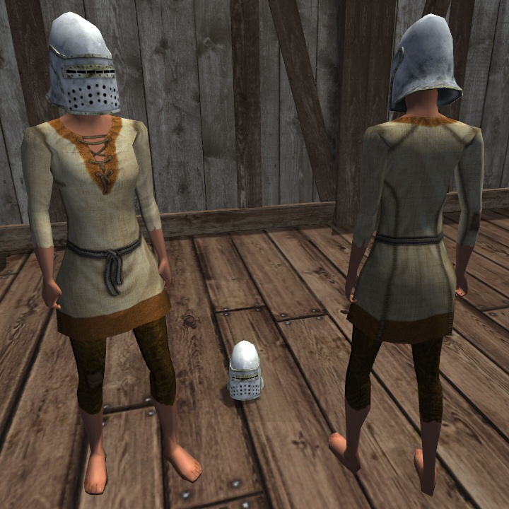 A basinet helm made from steel worn by a female player standing on wooden floor boards in front of a wooden house wall.