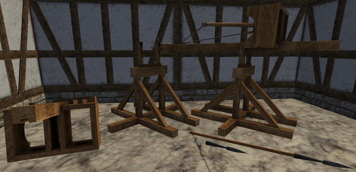 Here you can see a finished ballista (right), and an unfinished one (left), which also displays both the finished and unfinished version of the machine mount on marble slabs in front of a timber framed wall.