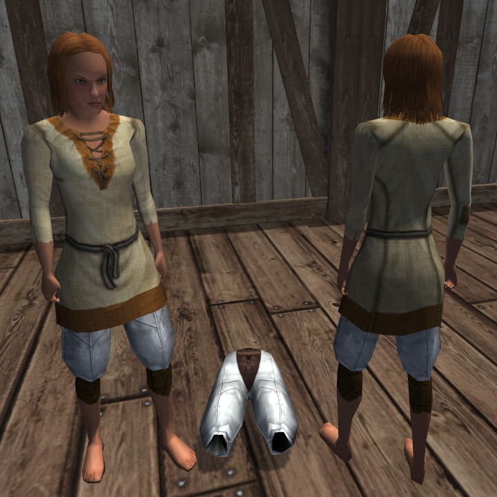 Plate leggings made from steel worn by a female player standing on wooden floor boards in front of a wooden house wall.