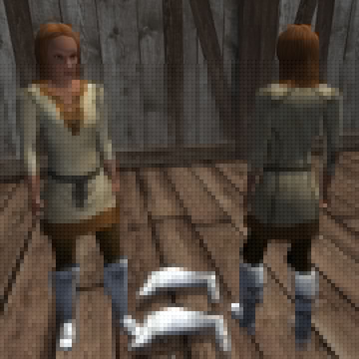 Plate sabatons made from steel worn by a female player standing on wooden floor boards in front of a wooden house wall.