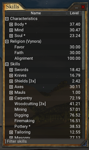 Hit <templatestyles src="Key/styles.css" /> F2 on your keyboard to show a list of your skills. There are 3 main categories in this window, characteristics, religion, and skills category. The characteristic sub-skills are values representing the current state of your body, mind and soul. For instance, to be able to attack anything, your body characteristic must be at least 1.5, or you will be too weak. Each sub-characteristic is again divided into several sub-characteristics, which have their own functions. For instance, the maximum amount of weight you can carry is determined by your body strength.