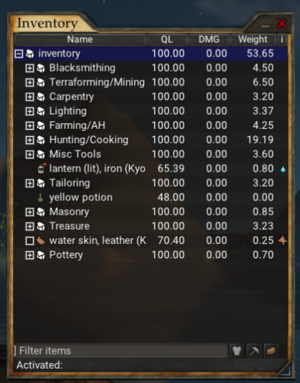 Your inventory is where you carry the items you start with, create and pick up. To activate an item, double left-click on it. To equip an item, Right click the item and click equip. You can also equip by opening your character sheet (C) and drag the items into the appropriate slot.