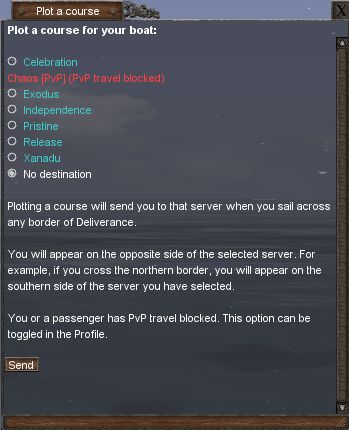 NOTE: If you are traveling across server borders, make sure all passengers are logged into the ship prior to crossing the border. Players logged off when a ship crosses the border may be left at their last log-in position on the previous server.