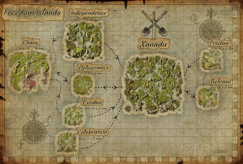 The ingame world map shows the standard connections between servers on the Southern Freedom Islands cluster, which includes Independence Deliverance Exodus Celebration Pristine Release Xanadu and Chaos: