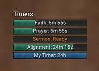 - Timers can be hovered over with the mouse to display a description. For timers with a maximum amount associated with them, like Faith gains per day, the amount you have left will also be shown.