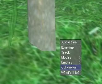 Once you find a batch of trees, go around examining them until you find one that says either “old” or “very old”. These trees give the most wood, and as thus, are the best to chop down. Activate your small axe and chop the tree. It will take a few chop actions, you can see how much damage the tree has by examining.