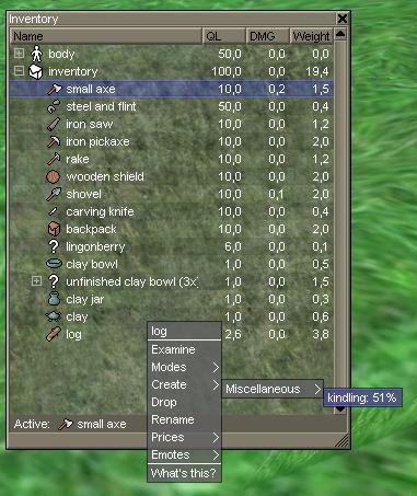 Once it reaches 100 damage, it will disappear and a felled tree or a log will be in front of you. If it is a felled tree, right click it and select “chop up” to make a log. Once you have a log in front of you, right-click it and select “take”. You will now have the log in your inventory. With your small axe activated, right-click the log and select create -> miscellaneous -> kindling.